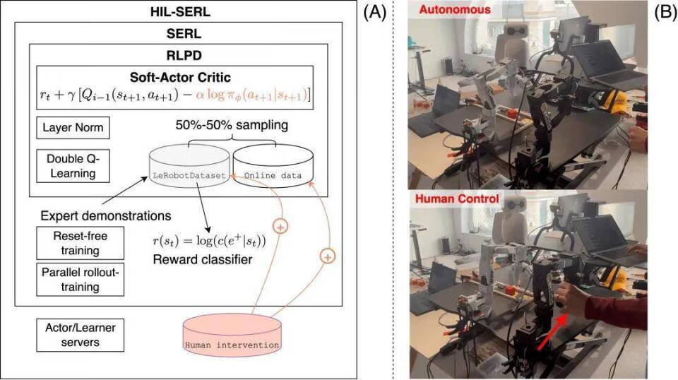 (A) HIL-SERL 通过借鉴 SAC、RLPD 和 SERL 的最新进展,实现了在现实世界中对高性能 RL 智能体的训练。 (B) 在真实 SO-100 上进行 HIL-SERL 训练过程中的人类干预示例。