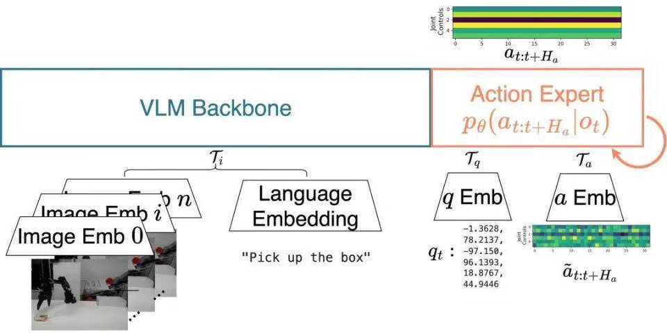 π0 架构。视觉与语言 token 被送入 VLM 主干,该主干被禁止关注机器人本体感知状态与动作 token;后者转而输入架构内一个更小的权重子集,称为「动作专家」。该架构在 1000 万 + 条轨迹上以 Flow Matching 训练,数据来自封闭与公开数据集的混合。