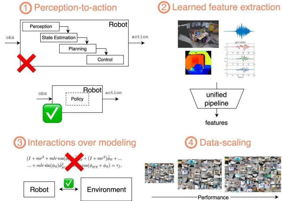 基于学习的机器人学通过训练一个(1)统一的高层控制器,能够直接处理(2)高维、非结构化的感知 - 运动信息,从而简化从感知到动作的过程。学习过程(3)无需动力学模型,而是聚焦于交互数据,并且(4)其效果与所用数据的规模呈经验性正相关。