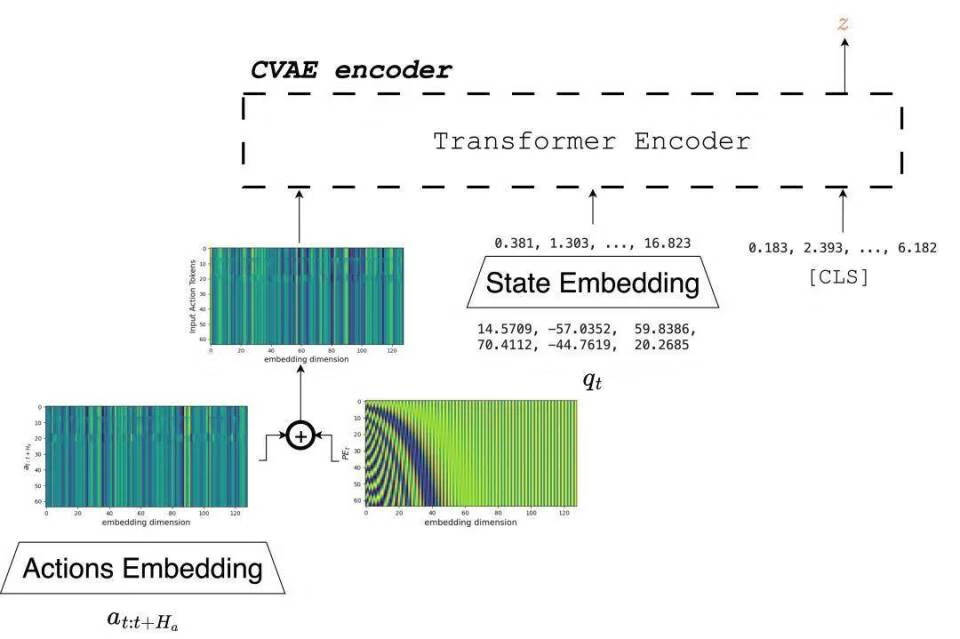 ACT 中使用的 CVAE 编码器。输入的动作块首先被嵌入并与位置嵌入聚合,然后与嵌入的本体感知信息以及一个用于聚合输入层信息并预测风格变量 z 的可学习 [CLS] 标记一起处理。该编码器仅用于训练解码器,在推理阶段完全被忽略。