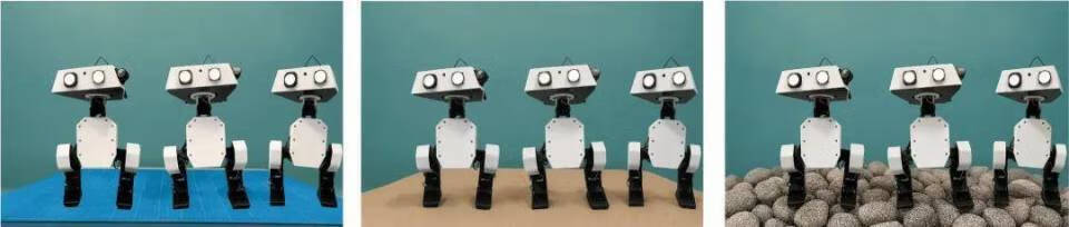 同一运动任务可在训练阶段于不同(仿真)域中执行(以地形差异为例),从而提升对多样化环境动态的鲁棒性。