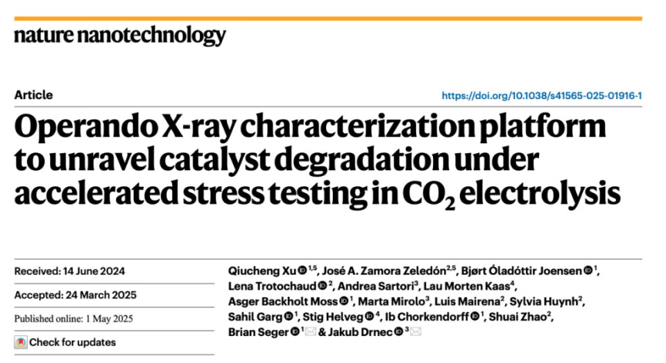 相关论文发表在 Nature Nanotechnology 期刊上,论文题目为《原位 X 射线表征平台用于揭示 CO₂ 电解中加速应力测试下的催化剂降解机制》(Operando X-ray characterization platform to unravel catalyst degradation under accelerated stress testing in CO₂ electrolysis),丹麦技术大学许秋成博士(现洛桑联邦理工学院博士后研究员)和何塞·A·萨莫拉·泽莱东(José A. Zamora Zeledón)博士是共同第一作者,丹麦技术大学布莱恩·塞格(Brian Seger)教授和欧洲同步辐射光源中心雅库布·德涅茨(Jakub Drnec)研究员担任通讯作者。