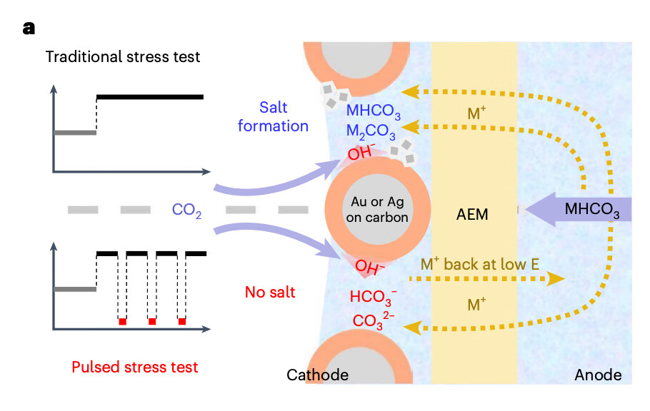 在电化学研究中,AST 通常用于快速评估电极的耐久性和电化学系统的稳定性。而在传统的水电解 AST 中,这是通过直接提升施加的电流密度来实现的,但这一方式容易加剧盐析的快速发生,来自阳极的阳离子与阴极生成的碳酸盐、碳酸氢盐结合,逐渐在气体扩散电极附近沉积。最终,盐分堆积导致电解器堵塞,系统提前失效。这类故障并非由催化剂本身的降解引起,而是由电极周围的严重盐沉淀触发,容易造成对催化剂稳定性的误判。