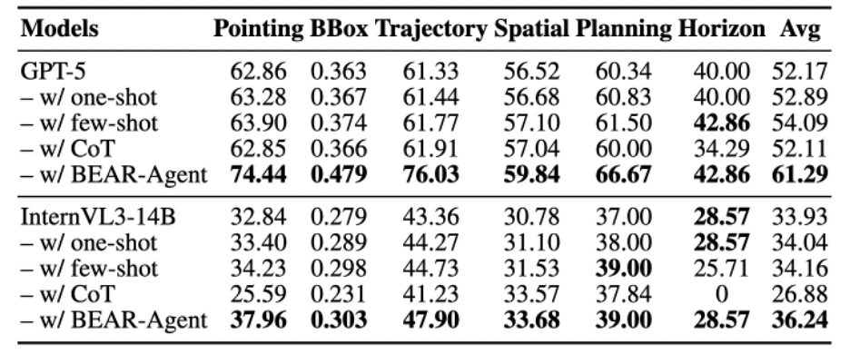 基于上面的发现,作者团队意识到,增强模型的视觉能力,可以全面提高模型的具身推理能力。在多模态领域,已经有一些工作通过画辅助线和教会模型使用工具用来求解数学问题。受这样工作的启发,作者开发了BEAR-Agent,这是一个可对话的多模态智能体,主要通过提供工具和做辅助线的方式增强模型的视觉推理能力,进而提升模型的具身推理能力。作者选取了表现最好的开源模型和闭源模型,InternVL3-14B和GPT-5,BEAR-Agent可以显著提高他们在BEAR上的performance。