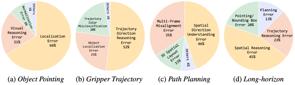 对于长程推理,与高层规划(planning)相比,底层感知和空间推理仍然是主要瓶颈,错误占比高达88%。