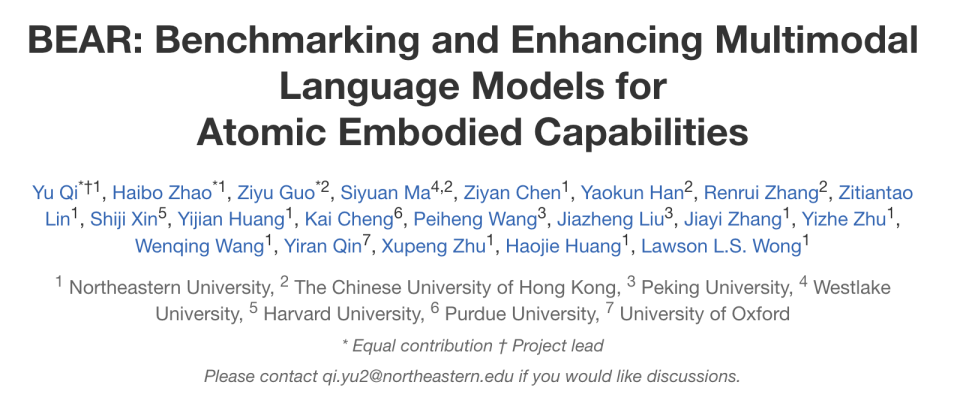 为了系统评估MLLM在具身智能的各个子能力,美国东北大学联合香港中文大学,哈佛大学,提出了BEAR基准,并且提供了详细的错因分析和算法提升。