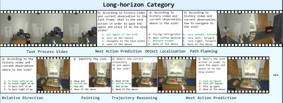 BEAR涵盖了4,469个图片-视频-文字的VQA。BEAR涵盖6个大类,其中包括5个基础类别,包括给点(Pointing), 给检测框(Bounding Box), 空间推理(Spatial Reasoning),任务规划(Task Planning),并且在每个类别下面还有不同子技能,如给点分为普通物体给点,空间关系给点和局部给点,共分为14个技能,见下图。除此之外,我们引入第六个长程推理类别,首次将具身智能的任务切分为以14个不同技能划分的步骤,涵盖了智能体在完成一个任务中所需要具备的技能。