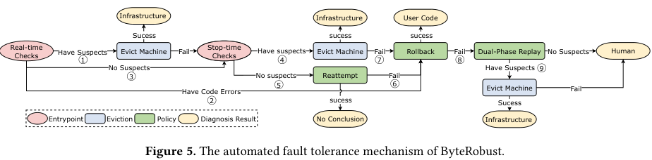ByteRobust通过一个三步过程,用“过度驱逐”的方式来隔离机器,从而解决这个问题,它避免了去精确定位根本原因。