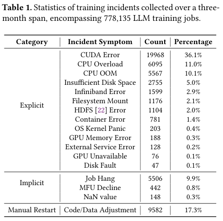 从表中可以看到,显式故障占总事件的69.3%,其中CUDA错误是最常见的故障类型,占了总事件的36.1%。