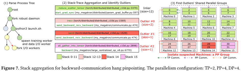 为了克服这个挑战,ByteRobust在检测到这些“静默故障”时,会挂钩并检查所有内部训练进程的堆栈跟踪,以此来定位故障机器。