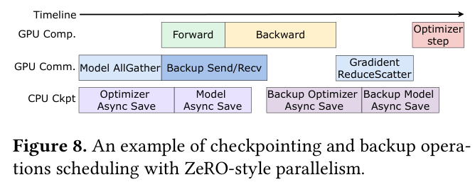 如上图所示,在一个3D并行配置(TP=2, PP=4, DP=2)中,每台机器的备份都位于一个不同的并行组中。