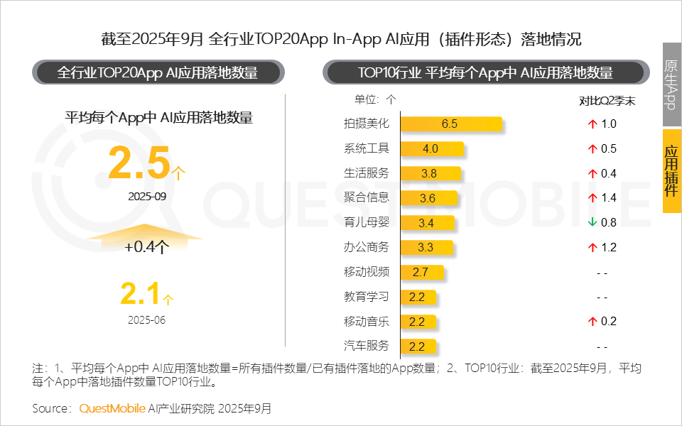 QuestMobile数据显示,在全网25个互联网行业中,各行业TOP 20 App范围内,针对有In-App AI落地的App,平均每个App内有2.5个AI应用落地,较上季度增加0.4个。