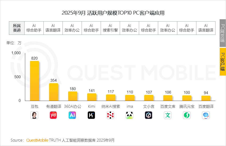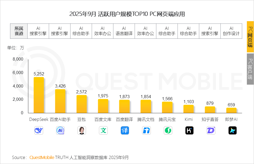 QuestMobile数据显示,2025年9月,绝大部分TOP10 PC端网页应用来自头部互联网集团,如百度、抖音、腾讯;百度AI助手、豆包、腾讯文档网页端用户规模分别达3,426万、2,572万和1,854万。