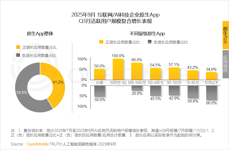QuestMobile数据显示,三季度内,75.0%的客户端应用出现负增长,10万以下客户端出现部分增长,但500-1000万体量客户端集体下滑,可能与功能迭代缓慢、用户体验同质化,或难以适应快速变化的AI需求有关。