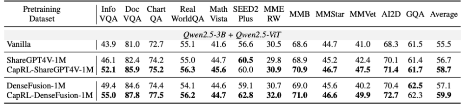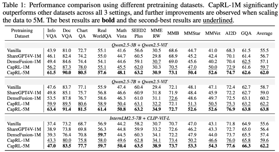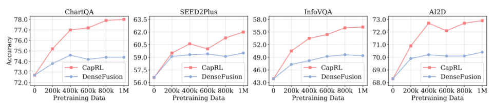 图 4. 使用不同预训练数据集的性能比较结果显示:CapRL-1M 在全部三个设置中均显著优于其他数据集,并且当数据规模扩展至 5M 时,模型性能进一步得到提升。