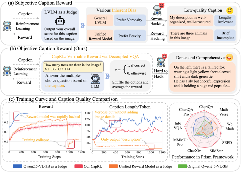 现有的一些方法尝试使用奖励模型(reward models)或 LVLM-as-a-judge 来提供 reward,如图 1(a)所示,但是这种方法非常容易受到奖励欺骗(reward hacking)的影响。模型可能学会利用奖励模型的漏洞(偏好冗长或简短的输出形式)来获得更高分数,而非真正生成高质量的描述,这种不可靠的奖励信号很容易导致在 GRPO 训练过程中出现异常,图 1(c)中展示了训练过程中出现了 caption 过长以及过短的情况,最终导致模型的表现不及预期甚至出现训练崩溃。