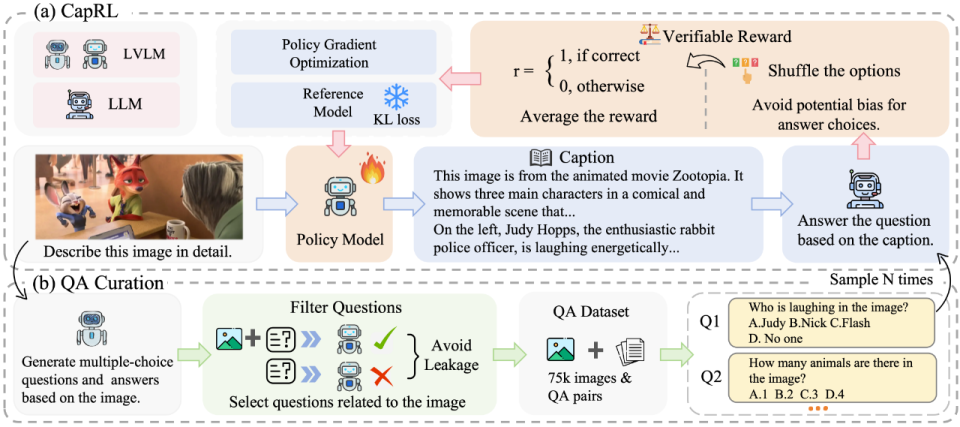 为了解决主观图像描述任务中 RLVR 奖励函数缺乏客观性的难题,我们提出了一种全新的视角:caption quality 与其实用性成正比。当图像描述足够详细且准确时,即使一个纯语言模型无法直接 “看到” 图像,也能回答与图像相关的视觉问答。例如图二中,对于问题 “图片里面谁在大笑?”,当描述中包含 “兔子警官 Judy 正在开怀大笑”,LLM 即可正确回答 “Judy”。
