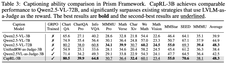 图 5. 在 Prism 框架下的图像描述能力对比中,CapRL-3B 的表现可与 Qwen2.5-VL-72B 相媲美,并且显著优于以 LVLM-as-a-Judge 作为奖励信号的现有方法。