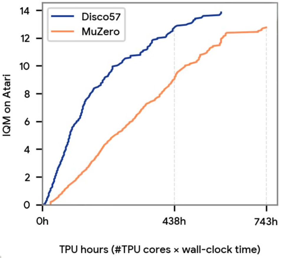 在此评估中,该团队使用的网络架构的参数数量与 MuZero 使用的数量相当。这是一个比发现过程中使用的网络更大的网络;因此,被发现的 RL 规则必须能泛化到这种设置。Disco57 取得了 13.86 的 IQM 分数,在 Atari 基准上超越了所有现有的 RL 规则,并且其运行效率 (wall-clock efficiency) 远高于当前最先进的 MuZero(见下图)。