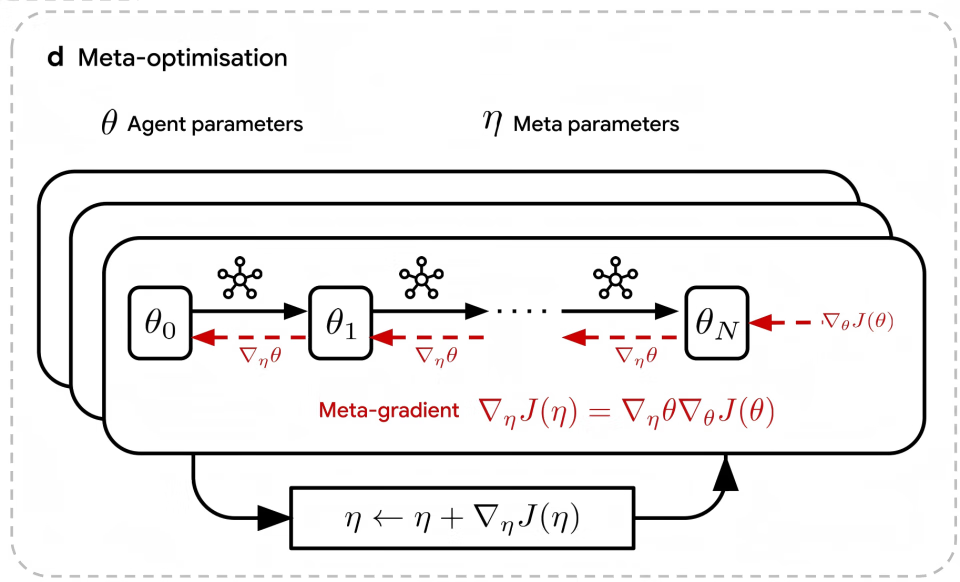 该团队的目标是发现一个 RL 规则(由元参数 η 表示的元网络来代表),它能让智能体在各种训练环境中最大化奖励。这个发现目标 J (η) 及其元梯度 可以表示为: