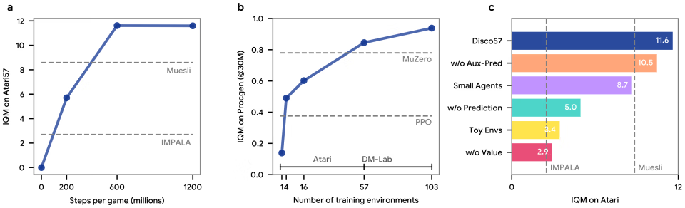 为了进一步了解该团队方法的可扩展性和效率,该团队在发现过程中评估了多个 Disco57(见上图 a)。最佳规则是在每个 Atari 游戏约 6 亿步 (内发现的,这相当于在 57 个 Atari 游戏上仅进行了 3 次实验。这可以说比手动发现 RL 规则更有效率,后者通常需要执行更多的实验,此外还要花费人类研究员的时间。