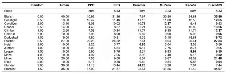 具体来说,该团队使用了由 Atari、ProcGen 和 DMLab-30 基准组成的 103 个更具多样性的环境,发现了另一个规则 Disco103。该规则在 Atari 基准上表现相似,同时之前所示的每一个已见和未见的基准上都提高了分数。特别是,Disco103 在 Crafter 上达到了人类水平的表现,并在 Sokoban 上接近了 MuZero 的 SOTA 性能。
