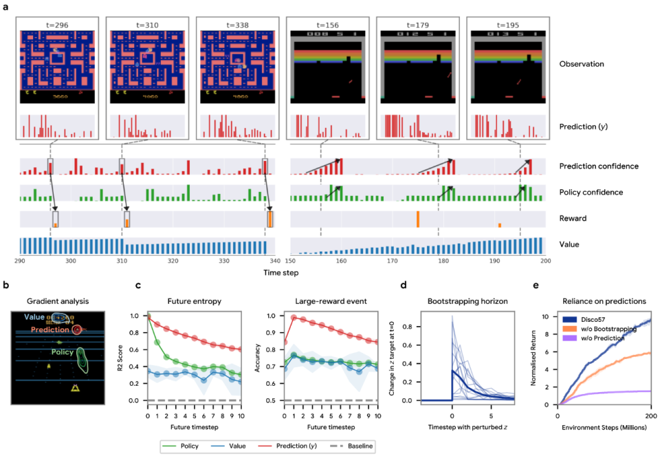 该团队还通过测量与观测的每个部分相关的梯度范数,研究了观测中的哪些特征会导致元学习的预测产生强烈反应。图 b 的结果显示,元学习的预测倾向于关注未来可能相关的物体,这与策略和价值函数所关注的地方不同。这些结果表明,DiscoRL 已经学会了在一个适度的范围内识别和预测显著事件,从而补充了诸如策略和价值函数等现有概念。