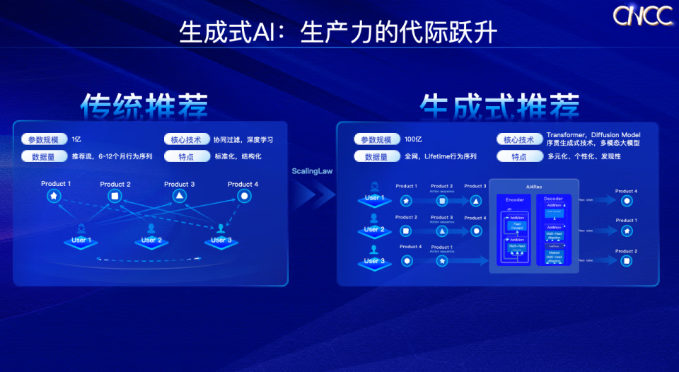 简单来说,传统推荐系统只能匹配现有实体来进行关联和预测,更适合标准化、结构化的需求;而生成式推荐,能够跳出原有的数据局限,生成新内容或动态策略,进行创造和推理,更适合多元化、个性化和发现性的需求,让算法更懂用户。