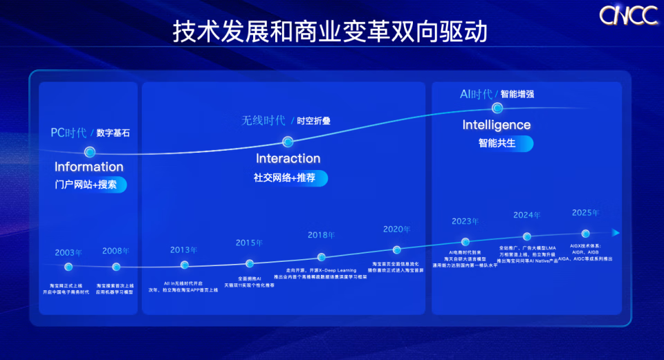 PC 互联网时代的关键词是「数字基石」,开放式硬件架构、图形化操作系统和软件生态重塑世界,门户网站与搜索引擎推动全民数字化启蒙。而就是在这一时期,2003 年淘宝上线,正式开启中国「电商元年」,并率先在搜索中应用机器学习模型,奠定技术驱动商业的基因。