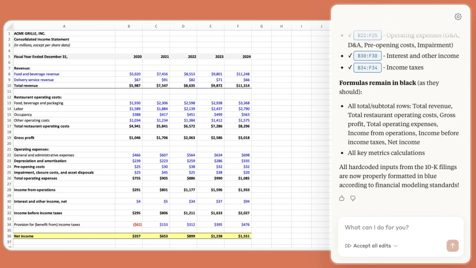 Claude正在分析一份包含Acme Grille, Inc. 2020-2024年合并损益表的电子表格,提供关于财务建模的实时指导