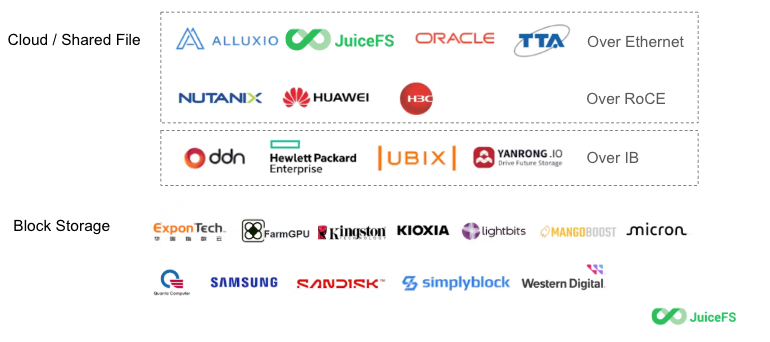 在这次 MLPerf Storage v2.0 的测试中,参与的厂商数量众多,涉及块存储和共享文件系统等多种类型,但由于这些类型的存储系统在架构和应用场景上差异大,且各厂商在测试中使用的硬件配置与节点规模差异显著,因此横向对比意义有限。本文将重点分析共享文件系统这一类别下的结果,为用户在类似场景中的选型提供更具参考价值的结论。