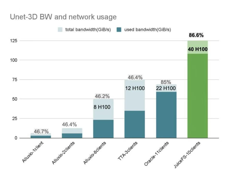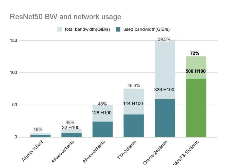 在该测试中,JuiceFS 在同类系统中支撑了最多数量的 500 张 H100 GPU,并在所有基于以太网的方案里实现了最高的网络带宽利用率,达到 72%,其余产品在此次测试中的带宽利用率大约在 40% 的水平。