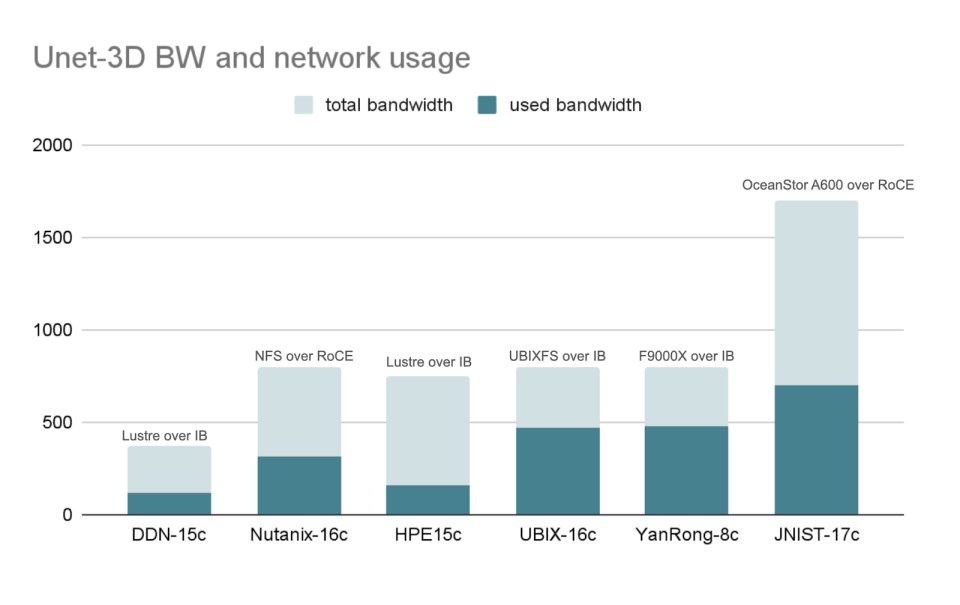 下图汇总了采用 InfiniBand (IB) 等专用高速网络的解决方案的测试结果。可以看出,使用 InfiniBand 网络的厂商凭借更高的总带宽和 IOPS,在支持的 GPU 数量 和 吞吐带宽 上取得了较高的成绩,但很多方案的网络利用率并不突出。