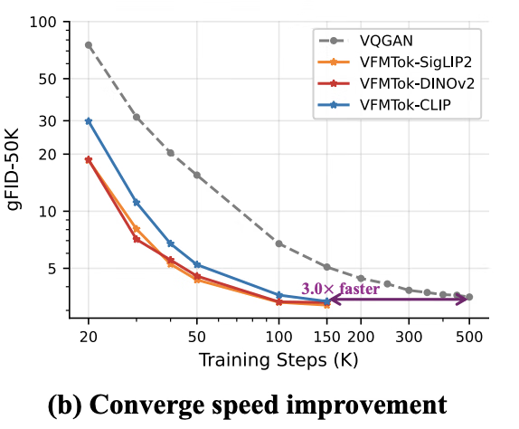 更快的生成训练收敛速度:相比于经典的 VQGAN 这类 Tokenizer,VFMTok 能够显著提升自回归模型训练阶段的收敛速度 —— 训练收敛速度提升了 3 倍。