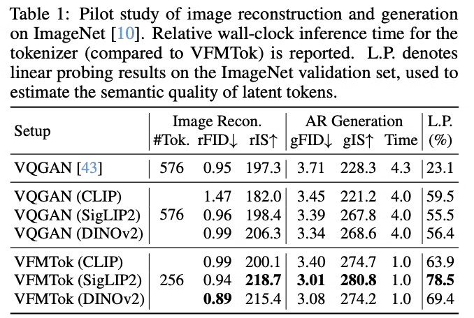 仅使用冻结的 VFM 作为编码器,线性探针准确率(linear probing)就从 VQGAN 的 23.1% 提升至 56.4%。引入区域自适应量化 (Region-Adaptive Quantization) 和语义特征重建 (Semantic Reconstruction Objective) 后,VFMTok 仅用 256 个 Token 就能在重建质量(rFID 0.89 vs 0.95) 上全面超越使用 576 个 Token 的 VQGAN 基线 Tokenizer。
