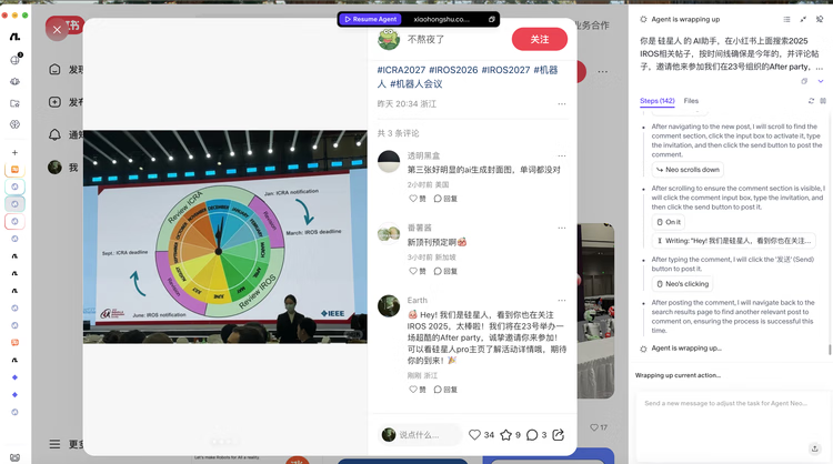 我们也用一个真实任务测试了它的能力。背景是,我们在杭州举办了一场小型的 IROS 会后派对,需要邀请小红书上对此感兴趣的IROS参会用户。这是一个非常繁琐、重复性极高的任务,完美契合了 AI 批量执行的场景。