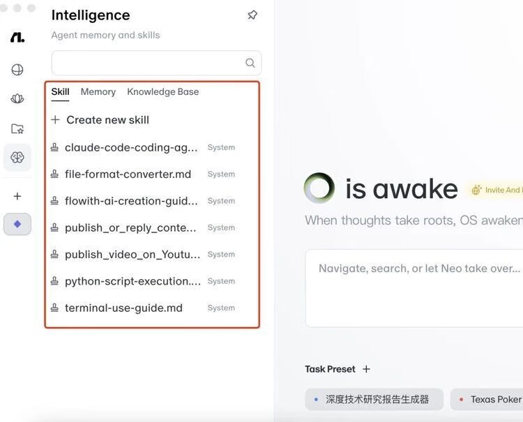 除了基础的产品逻辑,OS 还上线了一个关键功能:Skills。这与 Claude 有相似之处,更侧重于执行路径的沉淀。