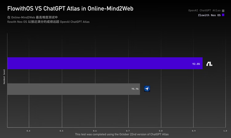 目前看来,这种激进也带来了实际的效果。在Online-Mind2Web的跑分中,Flowith OS已经超过了Altas。