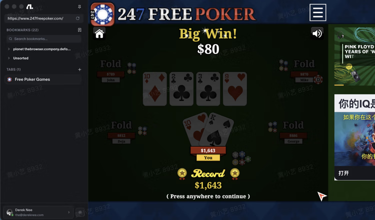除了这些严肃的工作,Flowith 还与我们分享了一个极具娱乐性的案例:让 OS 帮你打德州扑克,而且还赢钱了。