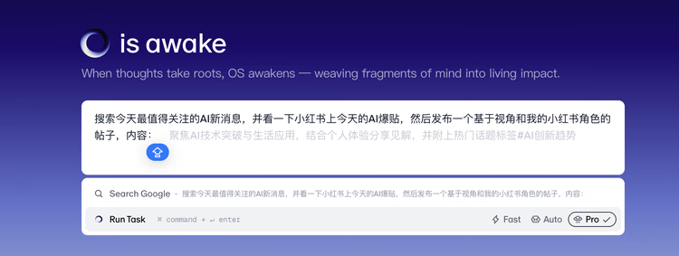 打开 FlowithOS,首先是一个颇有设计感的简洁界面,中心是一个输入框。你可以在框中选择 Google 进行搜索,把它当成一个普通的浏览器来用;或者,你可以选择 Run Task,直接进入 Agent 模式。