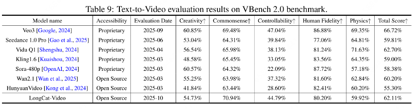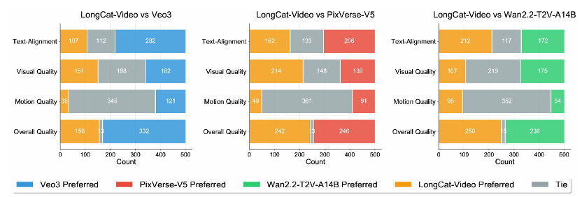 参数规模方面,LongCat-Video基座模型约136亿参数。评测覆盖文本对齐、图像对齐、视觉质量、运动质量与整体质量等维度;团队称在文本对齐与运动连贯等指标上表现突出,并在公开基准 VBench 等测试中取得较好成绩。