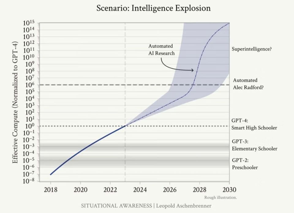 甚至有很多论文都这样说。比如,Leopold Aschenbrenner在论文里提到的那种「一飞冲天」的发展路径。