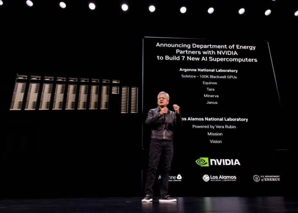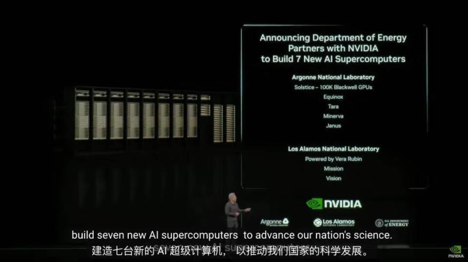 黄仁勋表示,得益于对 AI 基础设施史无前例的投资,美国的国家实验室正在进入一个科学发现的新时代。他宣布,美国能源部 (DOE) 正与英伟达合作,建造七台新的超级计算机,以推动未来科学的发展。