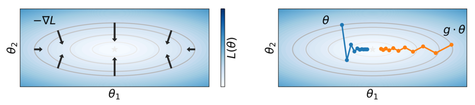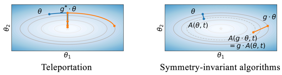 这种 “等损失、不同梯度” 的现象为算法设计带来了新的可能。部分优化方法尝试在等价轨道中主动寻找梯度更优的点,以加快收敛或改善最终解的性质(图 5 左);另一些方法则追求对称不变性,让优化结果对初始点的等价变换不敏感(图 5 右)。