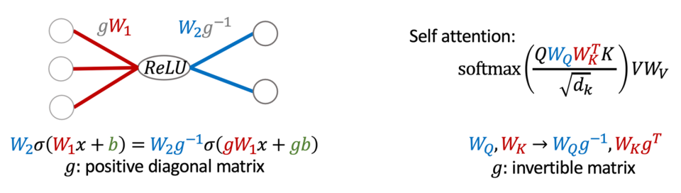 图 2 (左)ReLU 的缩放对称:对输入权重与偏置按对角矩阵 g 缩放,同时将输出权重乘以 g 的逆矩阵,函数保持不变。(右)自注意力的一般线性对称:键 (WK) 与查询 (WQ) 的线性变换 g 可以互相抵消,输出结果不变。