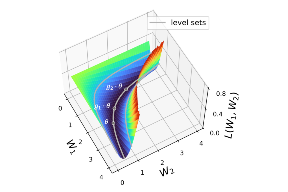图 3 连续对称性与平坦极小值:不同的参数 θ,g1 ⋅ θ,g2 ⋅ θ 具有相同的损失值,构成一条由对称变换生成的平坦轨迹。