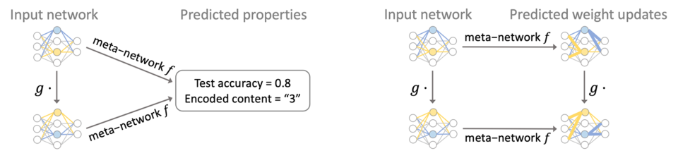 图 7 对称不变与对称等变的元网络:等变元网络可直接在模型权重上进行学习,被用于在预测模型的泛化能力,学习优化中的权重更新,以及生成满足特定特征的新模型等任务。
