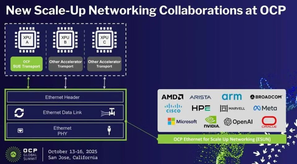 于是,这次峰会诞生了ESUN。它是基于以太网(Ethernet)的纵向扩展(Scale-Up)网络(Networking)项目。首批成员堪称豪华,包括AMD、Arista、ARM、博通、思科、慧与、Marvell、Meta、微软、英伟达、OpenAI和甲骨文。无论英伟达与 AMD最终投入多少资源,这一倡议本身,已构成业界罕见的共识。