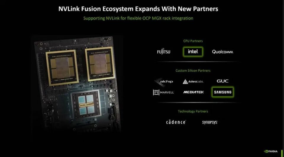在此之前,围绕纵向扩展,各大厂商一直各行其道。英伟达拥有自己的NVLink与NVSwitch,几乎完全封闭,只是在今年通过NVLink Fusion的形式,向AI世界工厂“适度开放”,允许客户将自己的CPU与英伟达的GPU一起使用,或将英伟达的GPU与其他定制AI芯片一起使用。三星,以及英伟达刚花了50亿美元入股的英特尔,已经加入这一生态。但这个生态仍然稍显狭窄,无法应对更复杂的AI定制芯片之间互联的未来。