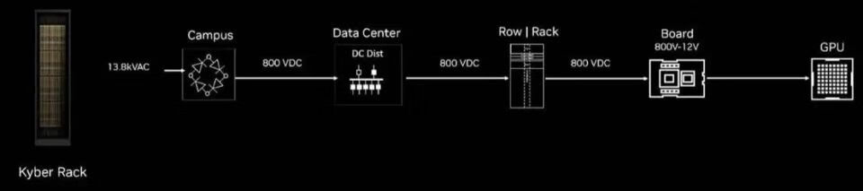 传统的54V机架电源系统,在高功率密度不断攀升的场景下,已暴露出电阻损耗高、铜缆用量激增等短板,难以满足AI时代的新需求。而且,传统现行架构需经过多级电能变换,将电网送来的中压交流电先降至低压交流,再由UPS调节并通过PDU与母线槽分配到机架内,历经多次转换,最终送到各计算节点。